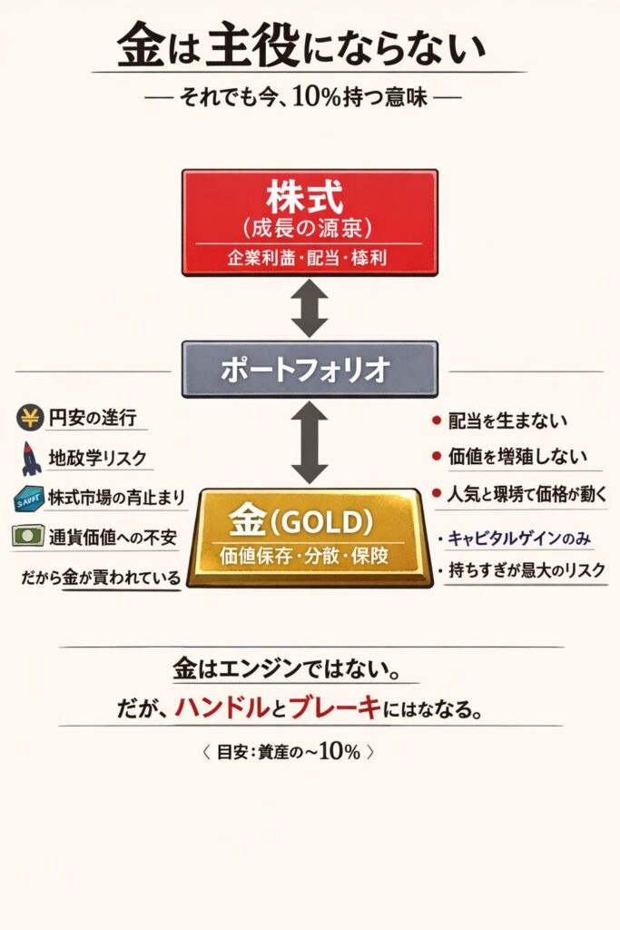 ここまでを踏まえると、金をポートフォリオの主役に据える発想にはなりにくい。