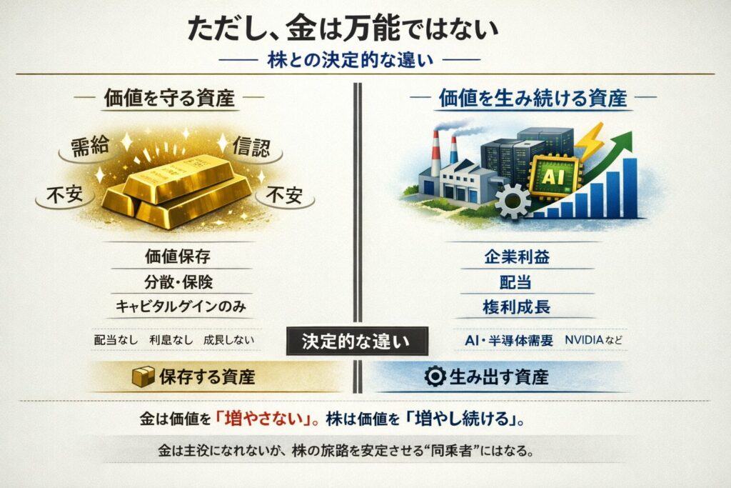 金は本質的にキャピタルゲインを狙う資産であり、株式のように価値を生み出し続ける存在ではない。