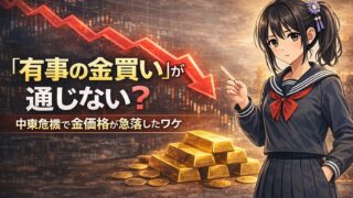 投資全般 有事の金買いが通じない?中東危機で金価格急落の理由 2026年の中東危機で金価格が約15%急落。「有事の金買い」が起きなかった理由を、ドル高・利上げ観測・攻撃前の過熱感など複数の要因から詳しく解説します。 2026.04.01 投資全般資産運用