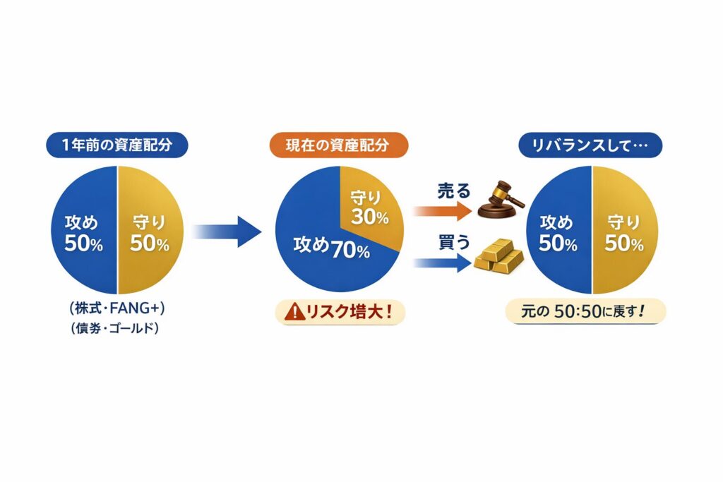 ここで必要なのが「リバランス」です。 具体的には、増えすぎた「攻め(70%)」の一部を売り、減ってしまった「守り(30%)」を買い増して、元の「50:50」に戻します。