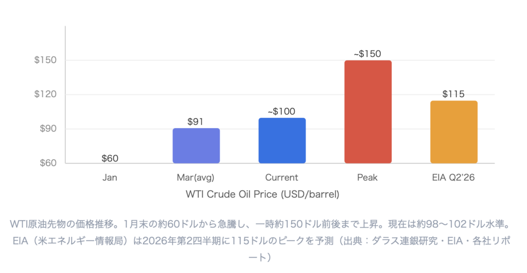 • 原油価格はすでに1月末の約60ドルから一時約150ドル前後まで急騰しており、EIAは2026年第2四半期に115ドルのピークを予測しています。