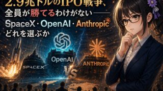 2026年にSpaceX・OpenAI・Anthropicが同時上場。合計評価額2.9兆ドルという前例なき「IPO戦争」を収益・成長率・投資家需要の3指標で徹底比較し、流動性争奪戦の勝者を分析します。