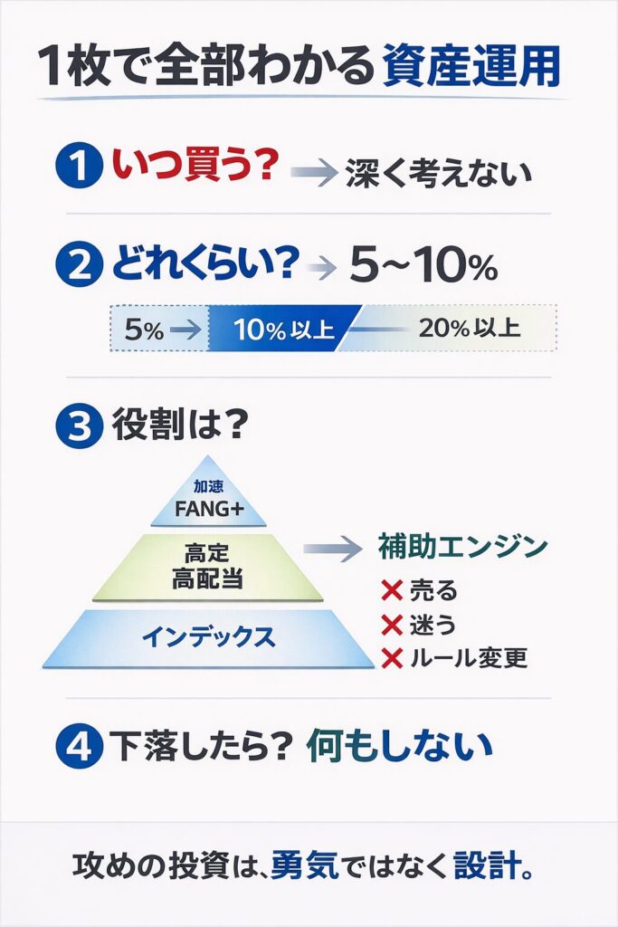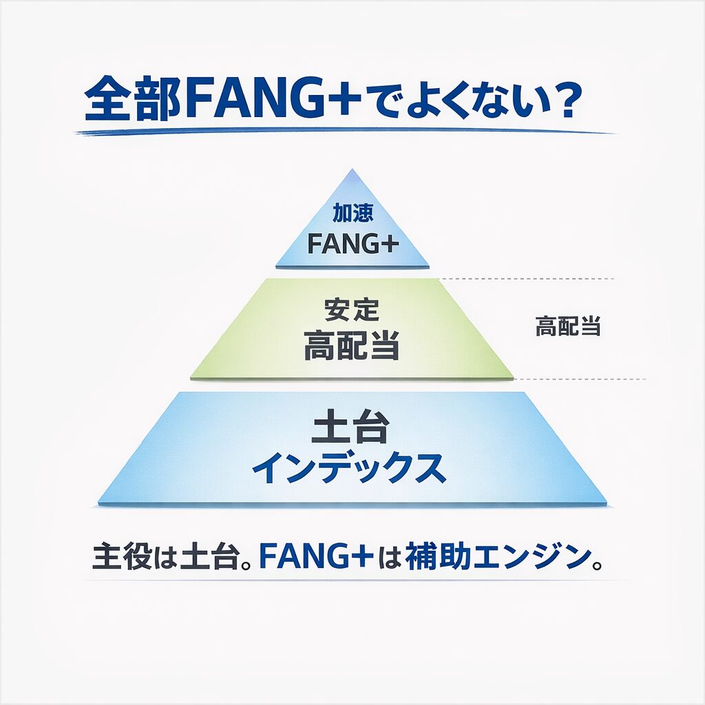 FANG+を**“守りと対立しない攻めの投資”**として紹介しました。